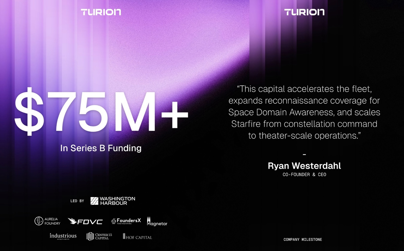 Turion Space, a leading space infrastructure company specializing in space domain awareness (SDA), orbital transport, and dynamic space operations, today announced the closing of its $75 million+ Series B financing round. The round was led by Washington Harbour Partners LP, with participation from existing investors Aurelia Foundry, Forward Deployed Venture Capital, and FoundersX Ventures, alongside new investors Center15 Capital, Magnetar, HOF Capital, and Industrious Ventures.