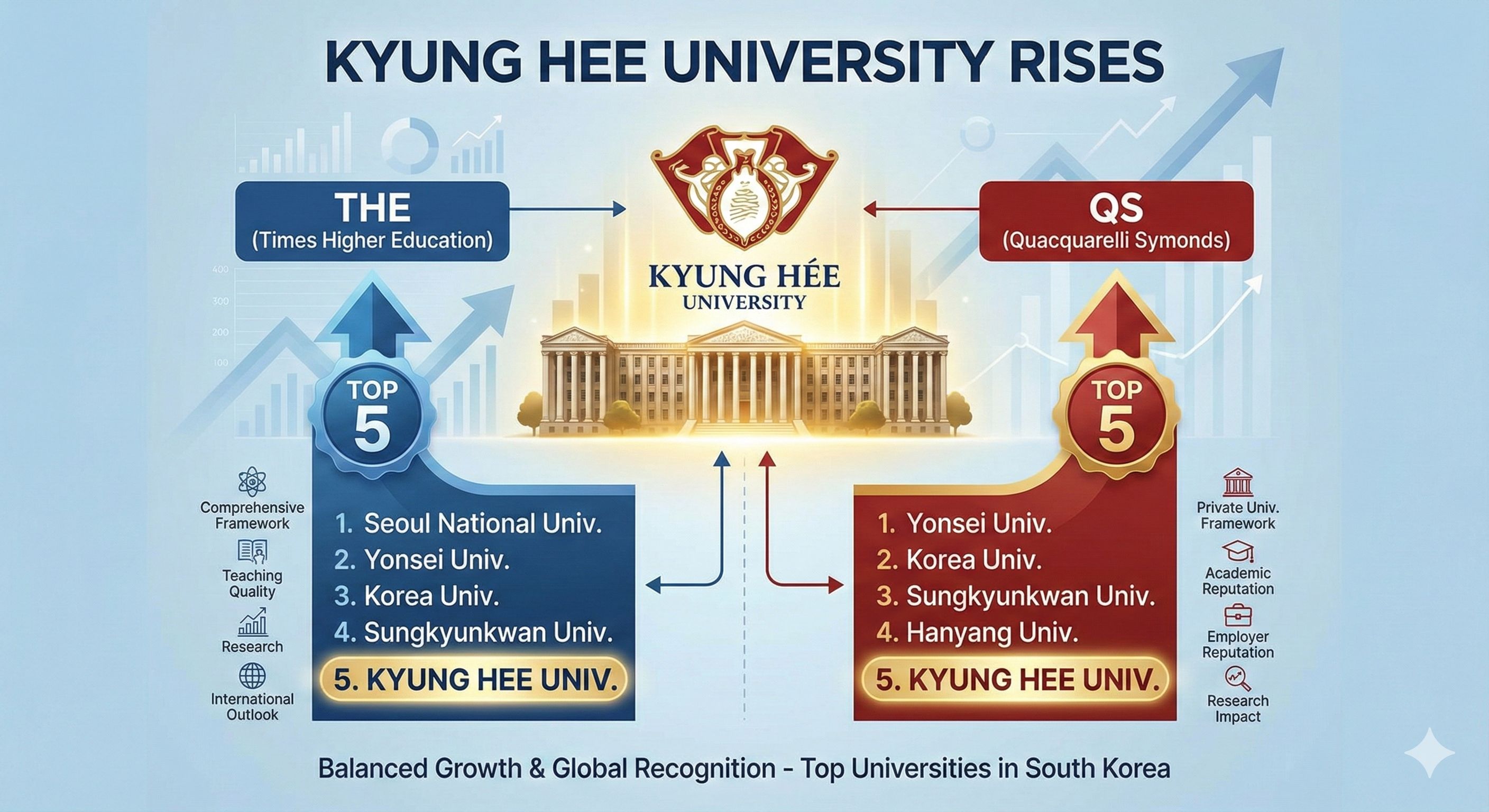 Established in 1949, Kyung Hee University is a prestigious private comprehensive university in South Korea, recently ranking 5th among domestic private universities in the 2026 THE World University Rankings. Renowned for its world-class research, KHU is rapidly rising as a global hub for academic innovation. More information about Kyung Hee University is available at Kyung Hee University, with additional global context from THE Rankings, QS Asia Rankings, Study in Korea, and Kyung Hee research and partnerships.