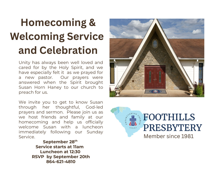 Unity Presbyterian Church, located at 750 Rainbow Lake Road in Inman, joyfully announces the arrival of its new pastor, Rev. Susan Horn Haney. The congregation will celebrate with a Welcoming Service and Homecoming Celebration on Sunday, September 28 at 11 a.m., immediately followed by a fellowship luncheon at 12:30 p.m.