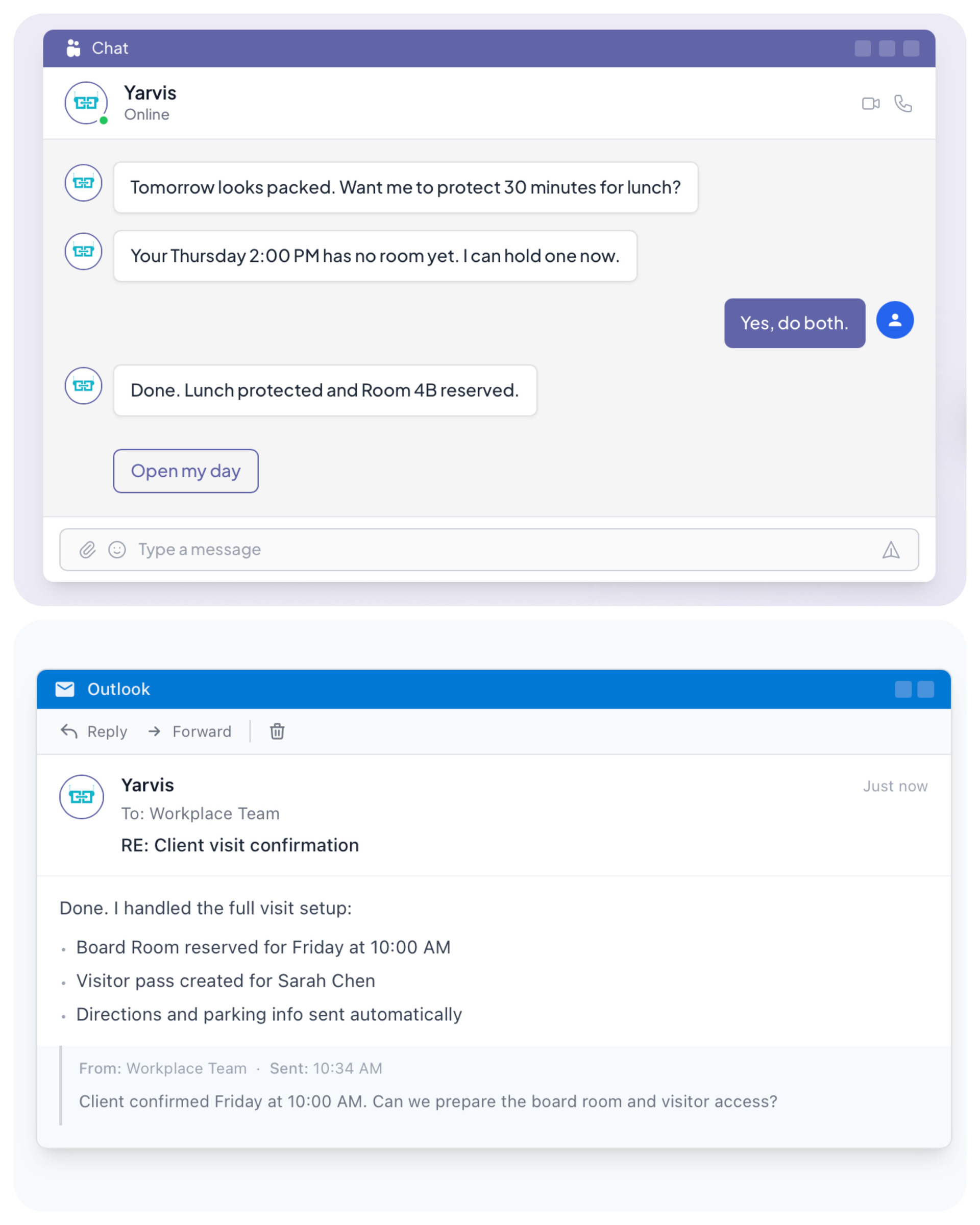 - Visitor management: CC Yarvis on a guest email and it creates the pass, books a room, reserves parking, and sends directions automatically.